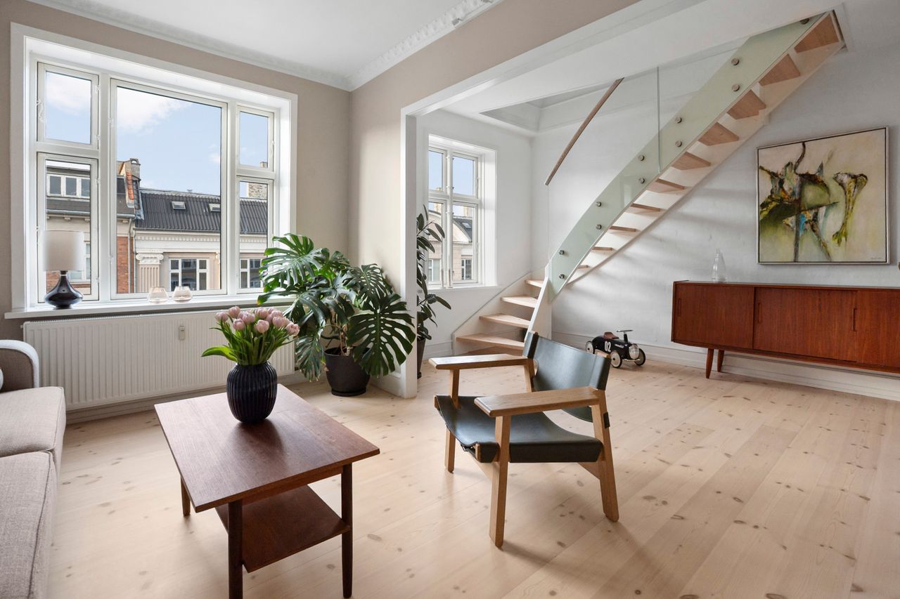 Højt hævet over Svømmehalskvarteret finder du denne pragtfulde penthouselejlighed i to etager – en bolig, der imponerer med sin store, solrige altan og en helt særlig atmosfære. Lejligheden er renoveret med nye, smukke gulve i hele boligen, så helhedsudtrykket fremstår både moderne og stilrent.