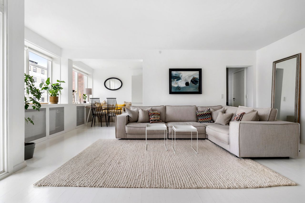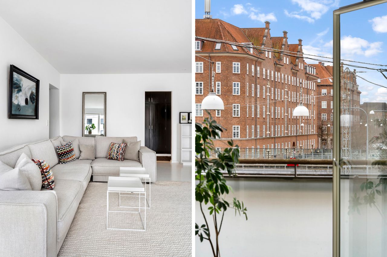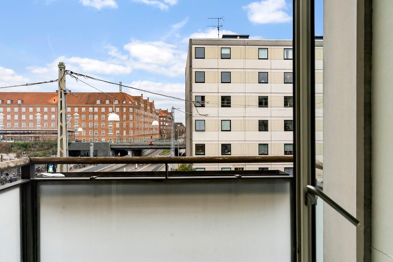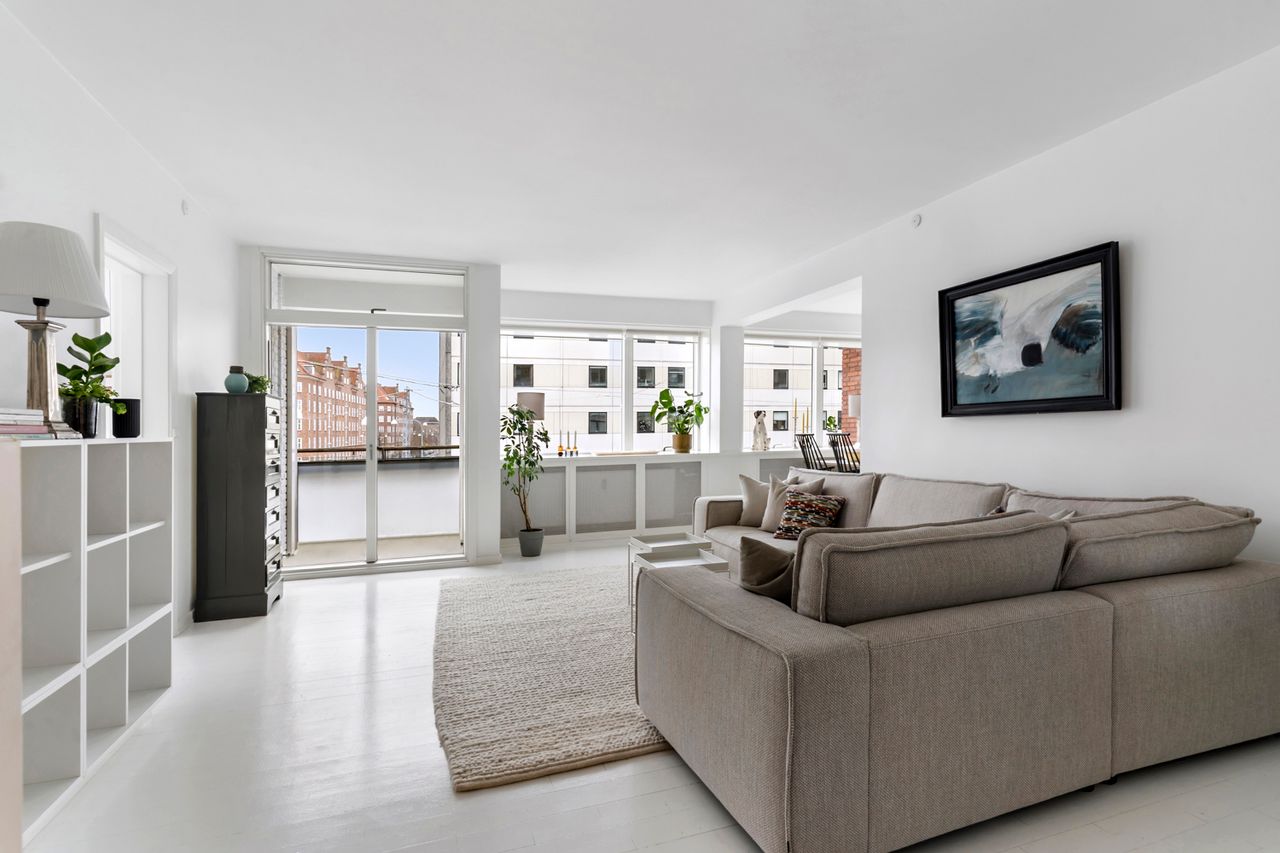 Stuen er rummelig og let at indrette med både sofaområde og spiseplads. Der er udgang til den sydvendte altan, hvor der er kig ned gennem Dalgas Boulevard og kig til himlen. Her er plads til både grillen og et hyggeligt havesæt. Lejligheden har god plads til både hverdag og gæster, og det flotte lysindfald skaber en behagelig atmosfære.