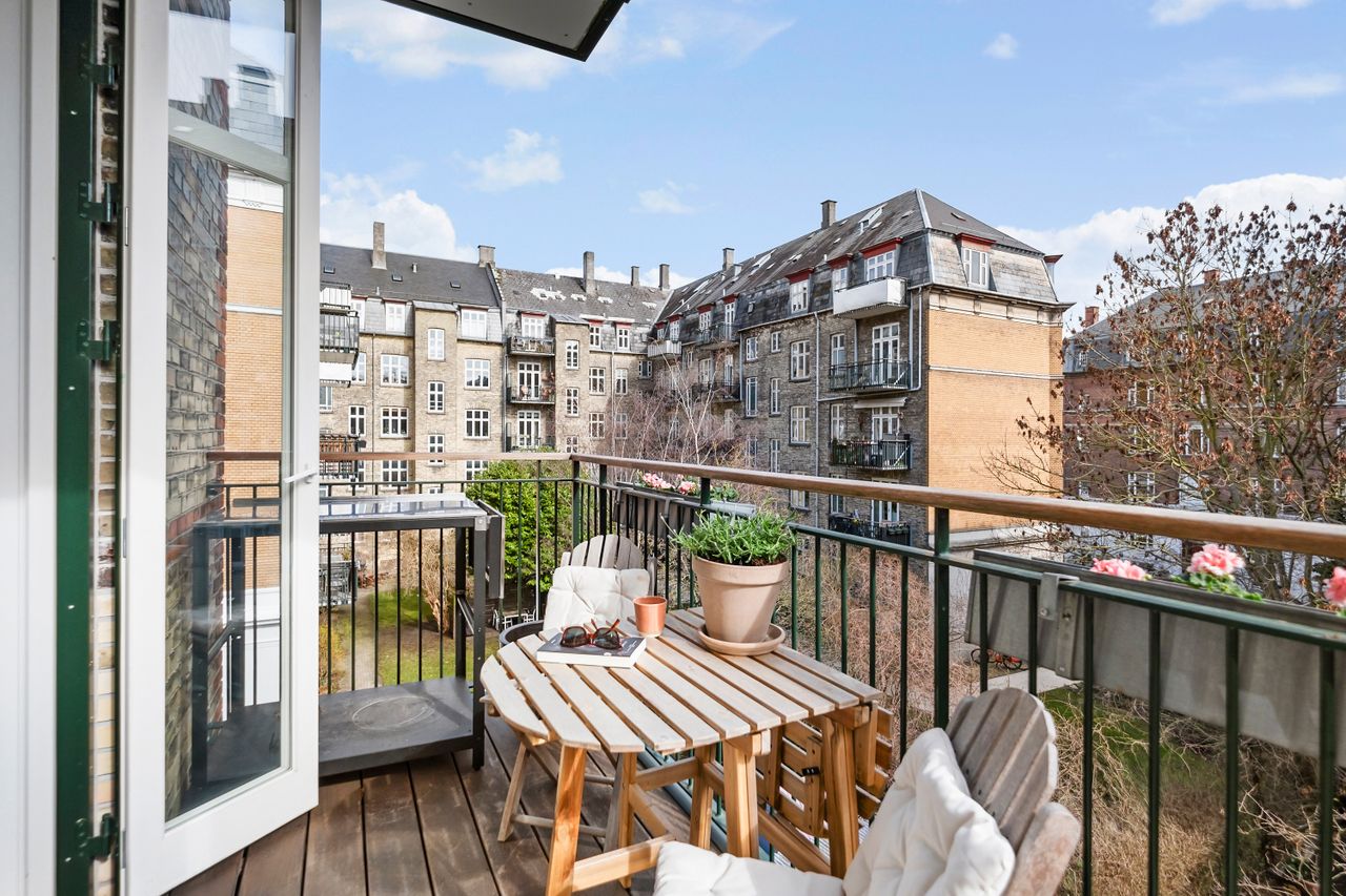 Lejligheden fremstår i gennemført stil med imponerende højloftede rum, detaljerede stuklofter, elegante radiatorskjulere, massive parketgulve og originale fyldningsdøre, som tilsammen skaber en eksklusiv og indbydende atmosfære. Væggene er fuldspartlede, og elinstallationerne er diskret integreret, hvilket understreger det stilrene udtryk. I 2019 blev lejligheden renoveret med fokus på kvalitet og æstetik. Det eksklusive snedkerkøkken fra Handcrafted Interior er udført med en smuk 30 mm Jura Grau marmor bordplade og fuldt udstyret med moderne hårde hvidevarer. Badeværelset er rummeligt og stilfuldt indrettet med elegante italienske klinker, gulvvarme samt integreret vaskemaskine og tørretumbler. Planløsningen er optimal med en indbydende entré med specialbygget snedkerbænk, et hyggeligt børneværelse med indbyggede skabe, samt to skønne stuer en suite med dobbelte fløjdøre og et fantastisk lysindfald samt udsigt til den charmerende allé. Det store soveværelse byder på en praktisk, indbygget skabsvæg og direkte udgang til en solrig altan med en fredelig, grøn udsigt over gårdhaven og områdets smukke træer.