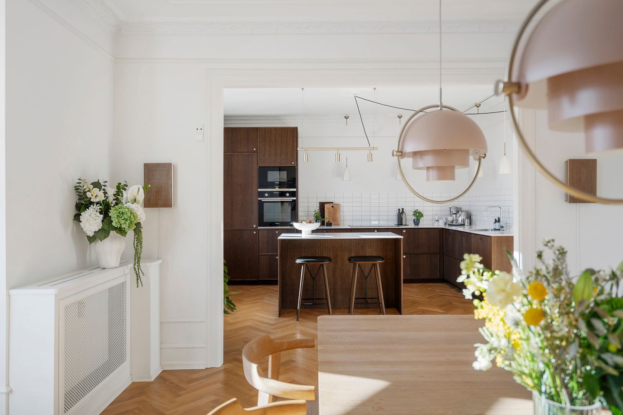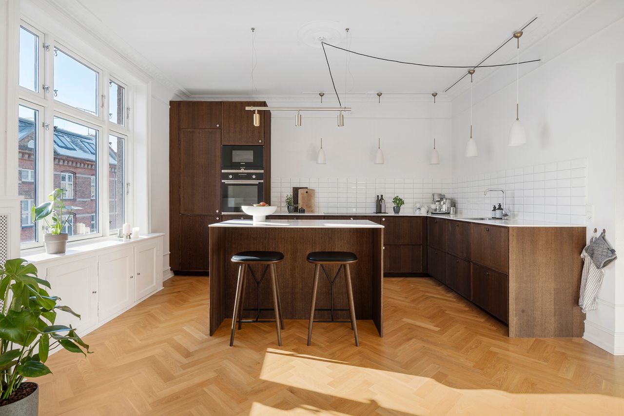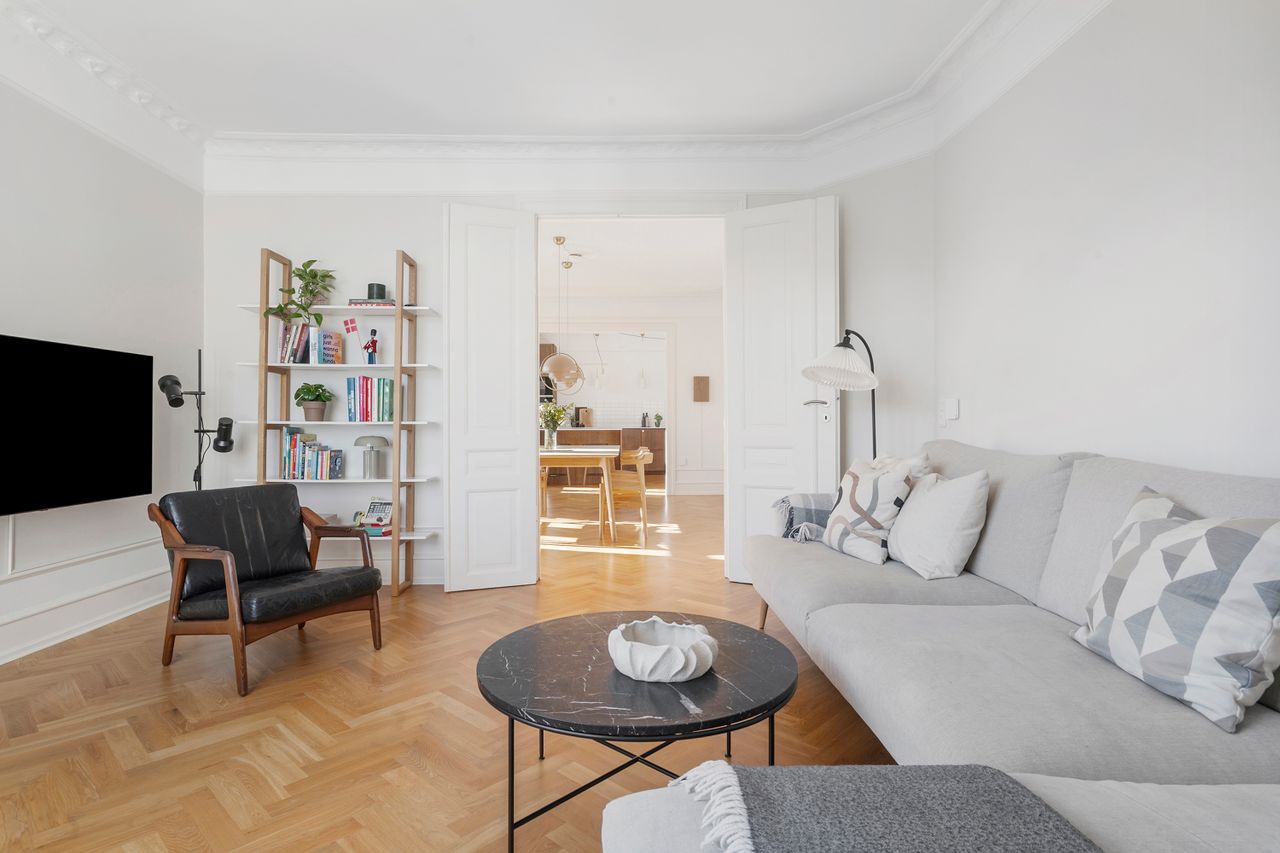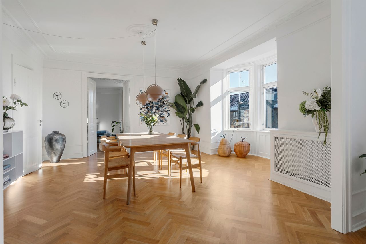 Lejligheden er renoveret med stor sans for detaljen. De smukke sildebensparketgulve uden dørtrin skaber et eksklusivt og harmonisk udtryk. Alt fremstår æstetisk og gennemtænkt med velvalgte løsninger. Det gælder ikke mindst det lækre køkken i mørk eg fra Reform, hvor intet er overladt til tilfældighederne. Dybe skuffer, en stilren bordplade og generøse arbejdsflader understreger den høje kvalitet og det gennemførte udtryk. De elegante stuer en suite giver masser af lys og luft og understreger lejlighedens herskabelige karakter. Køkkenet er flyttet fra det mindste værelse ind i den ene stue, hvilket har givet lejligheden et helt nyt udtryk. Den nye placering har samtidig gjort det muligt at lave et stort soveværelse mod gården med ro, luft og indbyggede skabe fra gulv til loft.