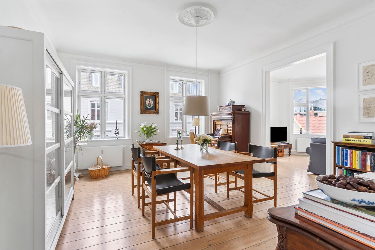 Lejligheden fremstår utrolig pæn, lys og indbydende. Igennem de senere år er ejendommen renoveret med fokus på moderne funktionalitet. Køkkenet er åbnet op, og gæstetoilet er skabt. Detaljer i en gammel herskabslejlighed, der gør den helt særlig. De smukke stuer en suite inviterer til gode stunder, og køkkenet bliver hurtigt samlingspunkt for familie og venner, mens der kokkereres.