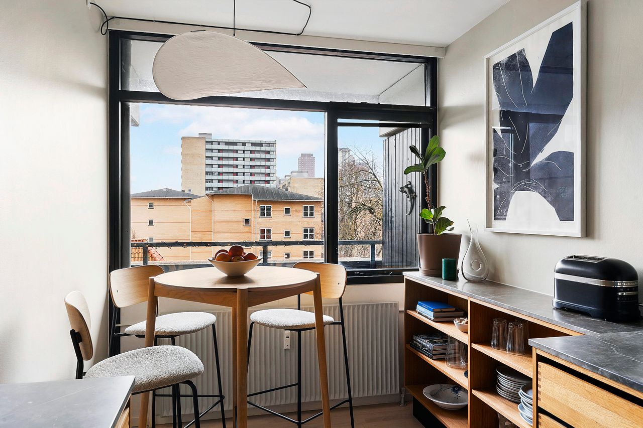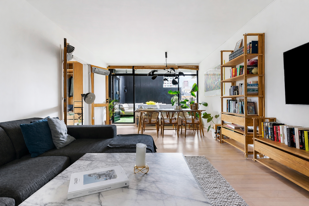 Køkkenet er renoveret af sælger med fokus på både kvalitet og æstetik. Du får et smagfuldt snedkerkøkken fra Heimwood, skræddersyet til lejligheden. Her er tænkt over detaljerne, fra de dybe skabe med god opbevaringsplads til skuffer med fingertappede egetræssamlinger og den smukkeste bordplade. De små, gennemtænkte løsninger som kaffestation m.m. fuldender helheden. Samtidig er der plads til et lille spisebord, hvor morgenkaffen eller en hurtig middag kan nydes. Lejligheden har en ideel planløsning, der giver fleksible indretningsmuligheder alt efter behov. I dag er boligen indrettet med en rummelig stue, fløjdøre ind til et master bedroom med stor skabsvæg samt et ekstra værelse. Og så til noget af det bedste, altanen. Udsigten er helt særlig og skal opleves. Altanen vender stik mod syd, hvilket giver optimale solforhold hele dagen. I sommerhalvåret bliver den et naturligt ekstra opholdsrum med plads til middagsselskaber under markisen, afslapning eller ren solnydelse. Her er du dejligt ugeneret.