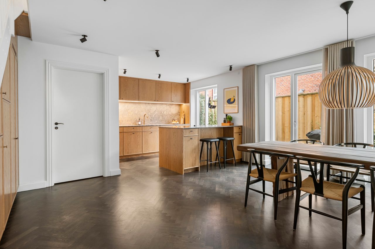 Byhuset imponerer indvendigt med eksklusive materialer og gennemtænkte løsninger, hvor kvaliteten er gennemgående i hver eneste detalje. Overalt i boligen er der lagt smukke sortolieret egetræsgulve med gulvarme, som giver en fornemmelse af gennemført perfektionisme. Det elegante snedkerkøkken er fra Handcrafted er udført med eksklusive bordplader i marmor. Køkkenet er fuldt udstyret med kaffestation, Quooker samt hårde hvidevarer i topklasse fra bl.a. Gaggenau. De 2 to badeværelser samt gæstetoilet er udført i flotte, tidsløse klinker, og badeværelsesmøbler samt låger ligeledes fra Handcrafted.