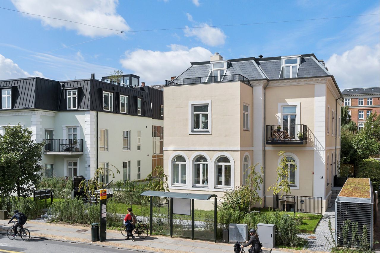 De smukke og karakteristiske ejendomme, Alhambravej 13-15A, er beliggende blandt de mest attraktive og populære adresser på Frederiksberg C. Det er en sidevej mellem Gammel Kongevej og Frederiksberg Allé, som forbinder indkøbsstrøget med Alléen - og er indbegrebet af det aller mest ægte Frederiksberg. Boligen ligger i 15A som er tilbagetrukket fra vejen. Her er fred og ro - selv med åbne døre til terrassen - og fra hoveddøren er du i gå-afstand til hele Frederiksbergs kulturelle liv, stemning og miljø, Frederiksberg Have, Værnedamsvej og ikke mindst alle de lækre specialbutikker på Gammel Kongevej og gastronomiske oplevelser i området. Af offentlig transport kan bl.a. nævnes metroen på Frederiksberg Allé, som ligger under 5 minutters gang herfra.