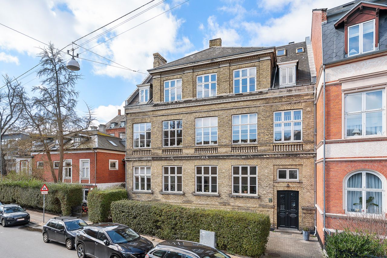 Lejligheden fremstår yderst herskabelig med sine 3,5 meter til loftet, smukke blyindfattede forsatsrammer og imponerende stuklofter. Alt sammen detaljer der er med til at give lejligheden den stil og stemning, som var arkitektens mening tilbage i 1884, da ejendommen blev opført. De store stuer en suite giver unægteligt fornemmelsen af lys, luft og albuerum. Den store åbning imellem køkken og spisestue inviterer til gode middage med familie og venner, mens kokken har god plads. Lejligheden er indrettet med 4 gode soveværelser - 3 af dem væk fra vejen.