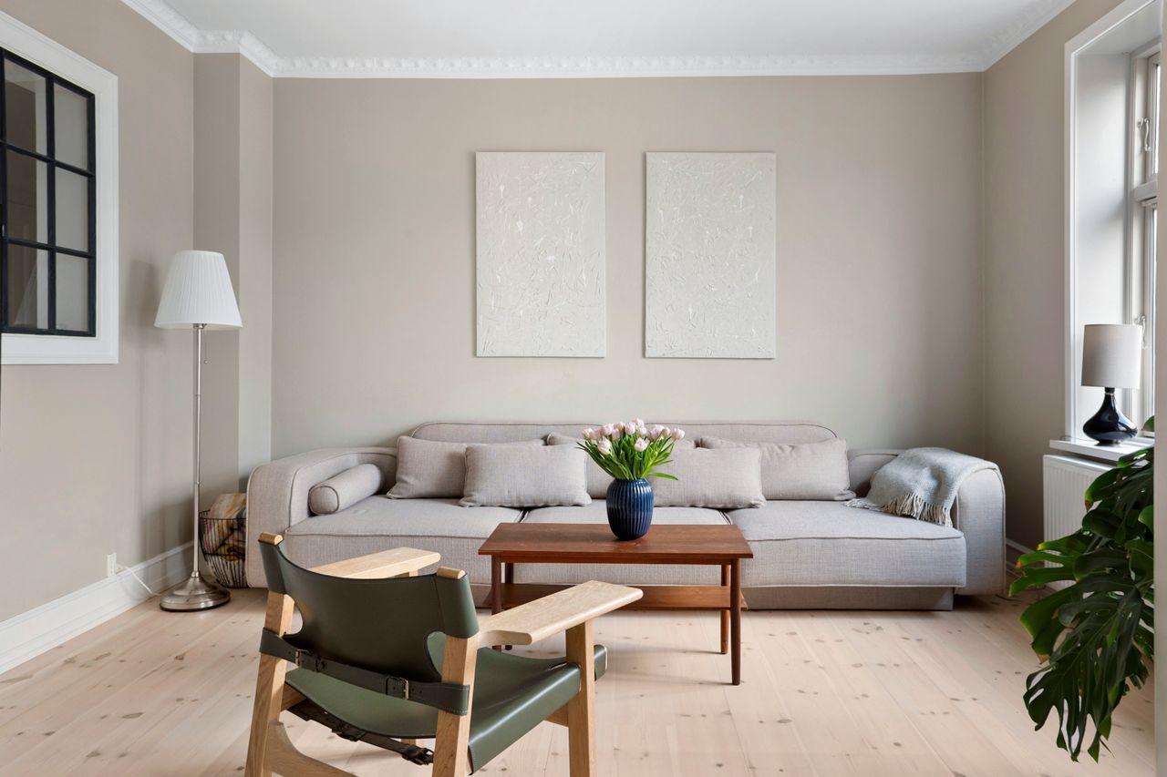 Indenfor mødes du af en rummelig entré, tre lyse værelser, et flot gæstetoilet og et lækkert badeværelse med elegante klinker, behagelig gulvvarme og integreret vaskemaskine med indbygget tørretumbler. Det stilfulde køkken-alrum ligger i åben forbindelse med den hyggelige opholdsstue, hvor lyset strømmer ind fra flere sider og skaber en skøn, harmonisk stemning dagen igennem.