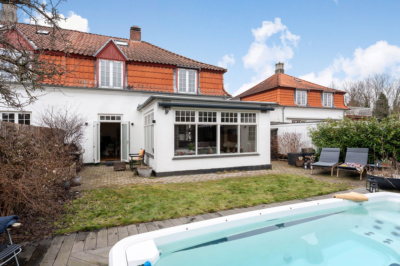 Denne særlige smukke ejendom ligger som en af de aller bedste i området. Ikke blot vender haven stik syd, så solen kan nydes i fulde drag fra tidlig morgen mod øst, til den går ned bag byens tage mod vest ud på aftenen. Tillige skal nævnes, at netop denne beliggenhed i den hvide by medfører en udsøgt ro i de hyggelige haver, og hvis man ikke har prøvet at bo her, kan man ikke forestille sig, at disse små perler findes midt i byen.