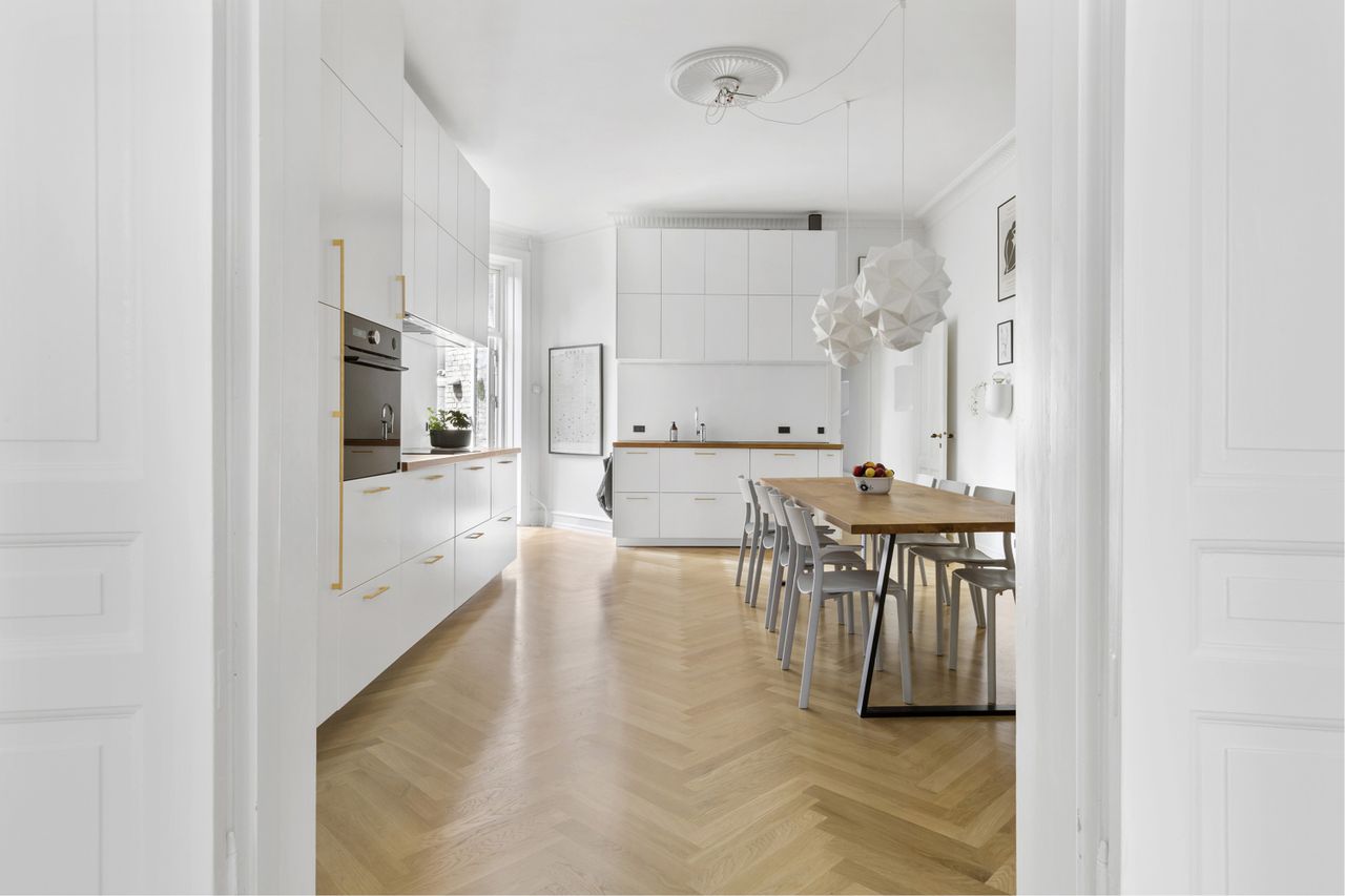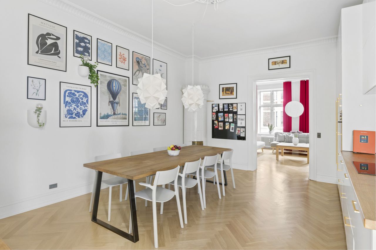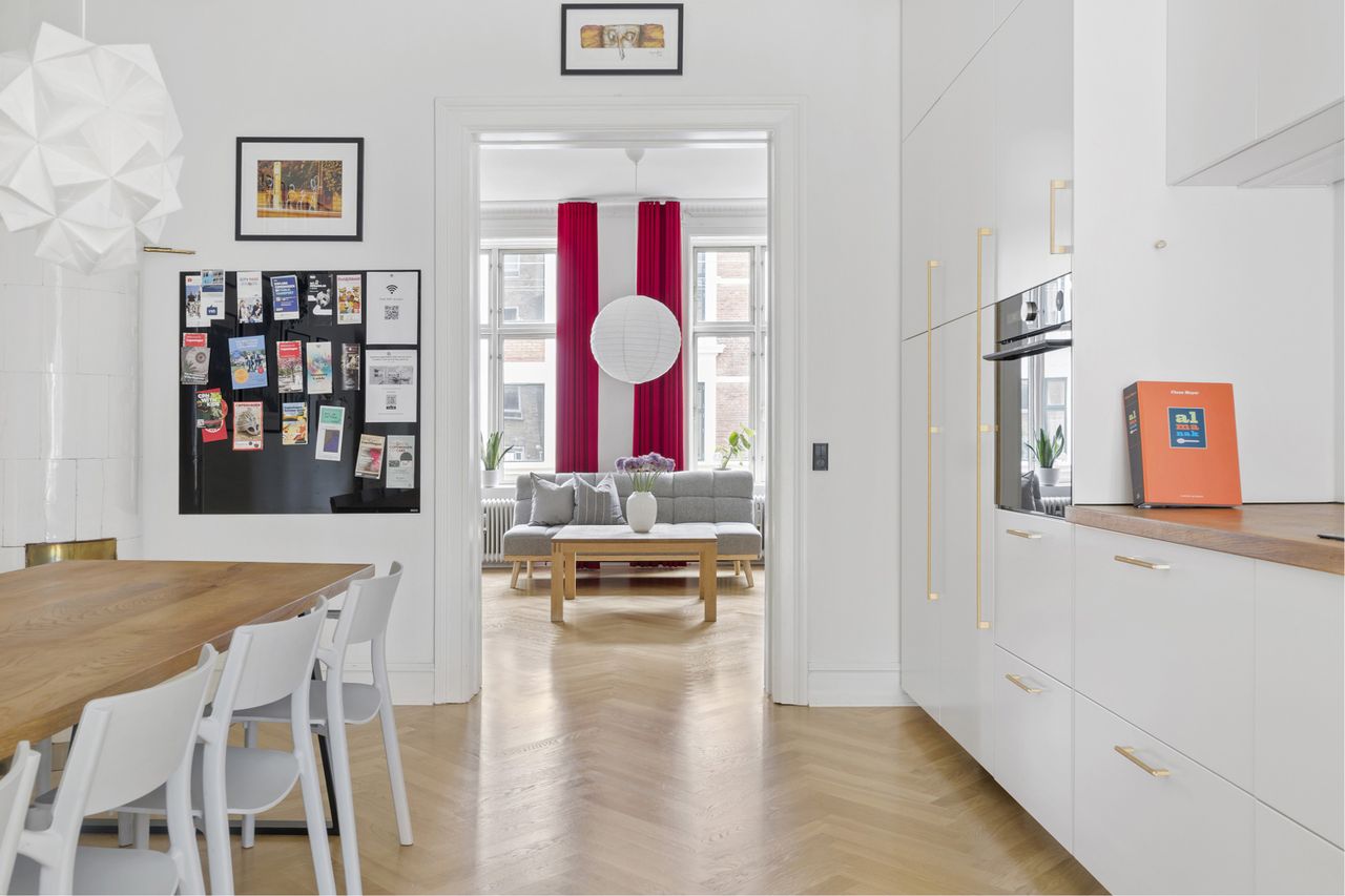 fyldningsdøre og smukke parketgulve i stuerne. Lejligheden blev gennemgribende renoveret i 2020, med