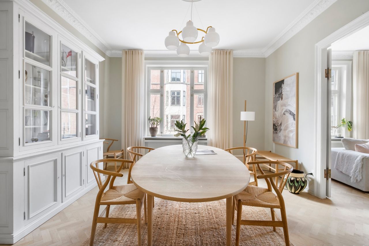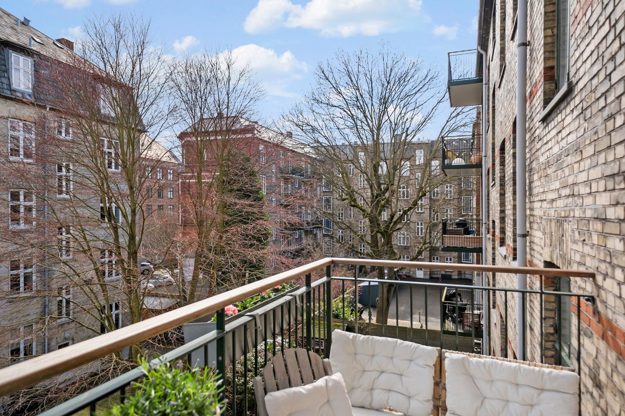 Lejligheden fremstår i gennemført stil med imponerende højloftede rum, detaljerede stuklofter, elegante radiatorskjulere, massive parketgulve og originale fyldningsdøre, som tilsammen skaber en eksklusiv og indbydende atmosfære. Væggene er fuldspartlede, og elinstallationerne er diskret integreret, hvilket understreger det stilrene udtryk. I 2019 blev lejligheden renoveret med fokus på kvalitet og æstetik. Det eksklusive snedkerkøkken fra Handcrafted Interior er udført med en smuk 30 mm Jura Grau marmor bordplade og fuldt udstyret med moderne hårde hvidevarer. Badeværelset er rummeligt og stilfuldt indrettet med elegante italienske klinker, gulvvarme samt integreret vaskemaskine og tørretumbler. Planløsningen er optimal med en indbydende entré med specialbygget snedkerbænk, et hyggeligt børneværelse med indbyggede skabe, samt to skønne stuer en suite med dobbelte fløjdøre og et fantastisk lysindfald samt udsigt til den charmerende allé. Det store soveværelse byder på en praktisk, indbygget skabsvæg og direkte udgang til en solrig altan med en fredelig, grøn udsigt over gårdhaven og områdets smukke træer.