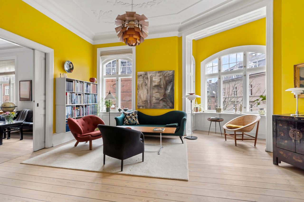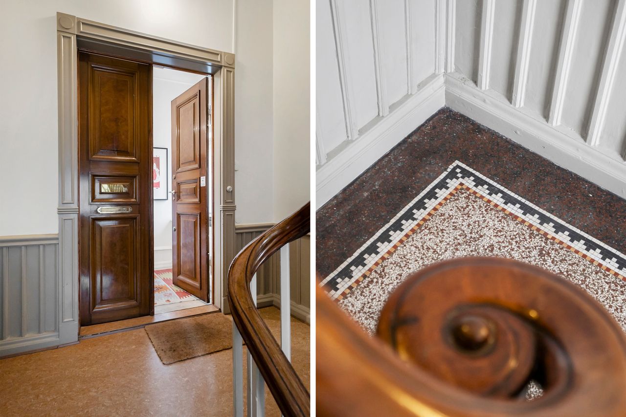 Vi har her en ægte herskabslejlighed, hvor autenticitet og klassiske detaljer virkelig kommer til deres ret. Lejligheden ligger smukt på et hjørne, og allerede når man træder indenfor, fornemmer man den særlige atmosfære. Der er så mange fine detaljer, at man opdager noget nyt, hver gang man bevæger sig gennem rummene. Her er højt til loftet og man kan virkelig beundre de dekorative rosetter og stuklofter, der varierer fra rum til rum og vidner om en tid, hvor håndværket var i højsædet.