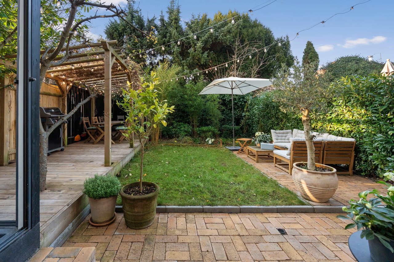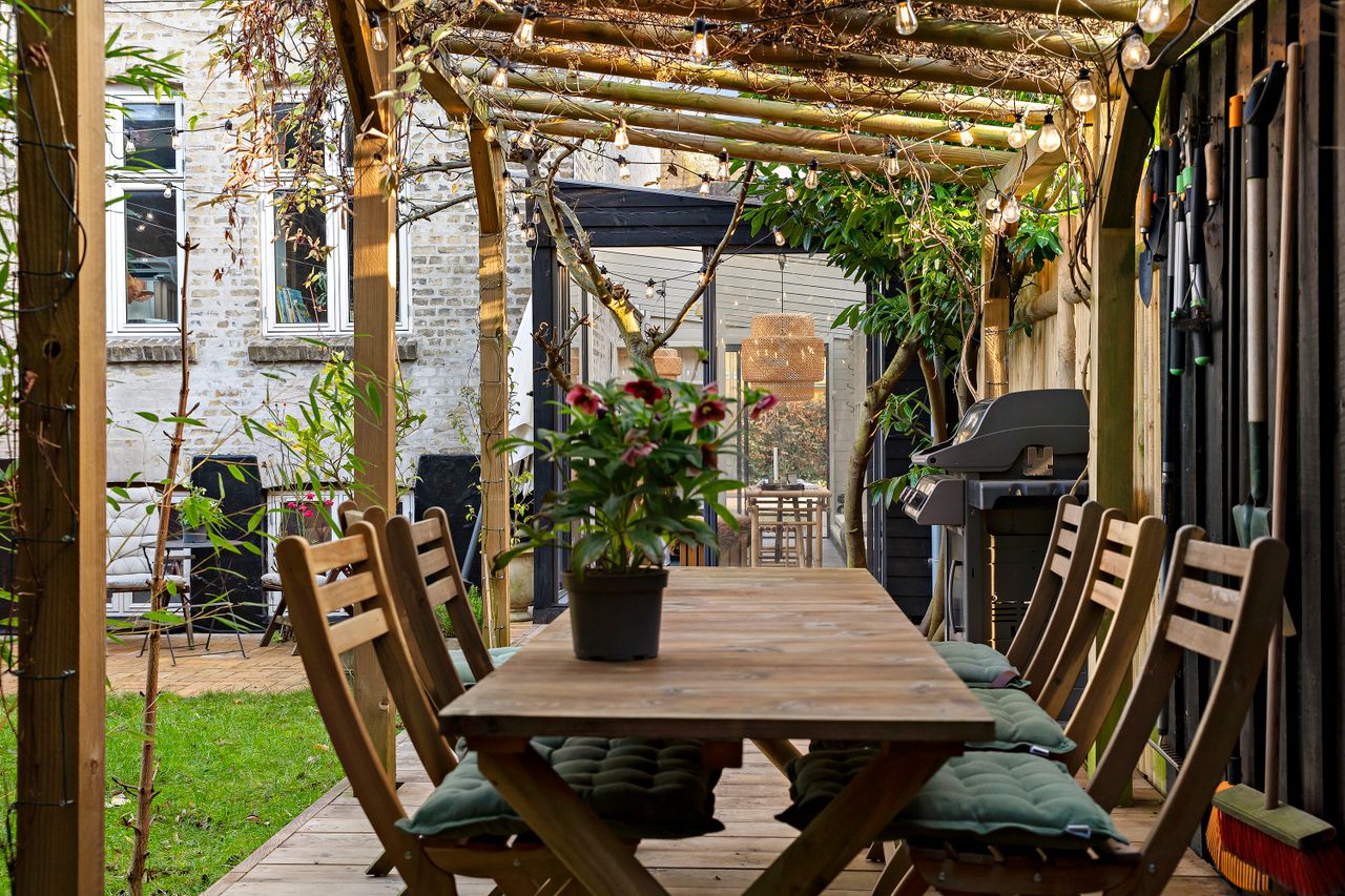 Ejendommen er opdelt i 3 lejligheder. Haven er også opdelt, så man har sit helt eget havestykke, som er både privat, hyggeligt og idyllisk. Havestuen er en lille perle, og sælger fortæller, hvordan de ofte har nydt de lange sommeraftener i haven og trukket ind i havestuen i sommerregn, eller når duggen faldt på. Det er en oase midt i byen.