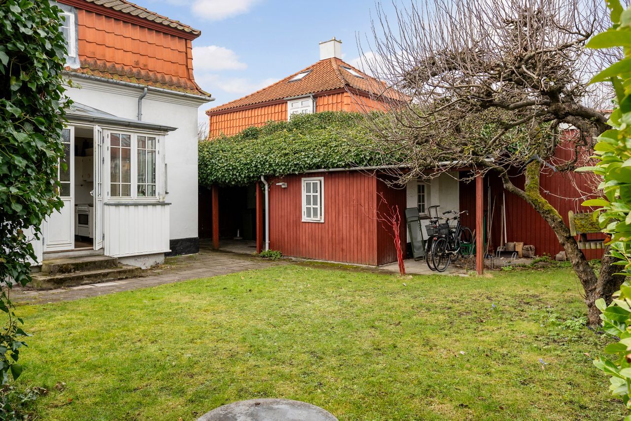 Den sydvendte have på 331 m² er en fredfyldt oase, med hyggelige solterrasser og dejlig ugeneret uden indkig fra naboer – perfekt til afslapning og udendørs aktiviteter. Til ejendommen hører også en overdækket areal med plads til cykler og udhus hvor der er indrettet vaskerum og fyrrum.
