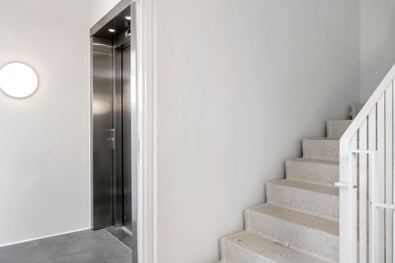 Opgangen fremstår utrolig flot, lys og indbydende med overflade som hvid terrazzo og håndlister i hvidlakeret fladstål. Til ejendommen hører også en hyggelig legeplads med legeting i træ/natur. Intet plastic.