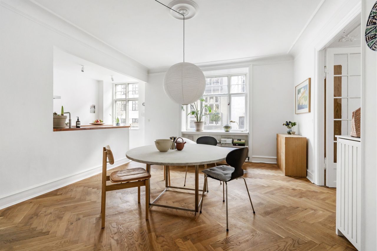 Lejligheden fremstår flot og renoveret med sildebensparket, skabe fra Handcrafted Interior, åbent