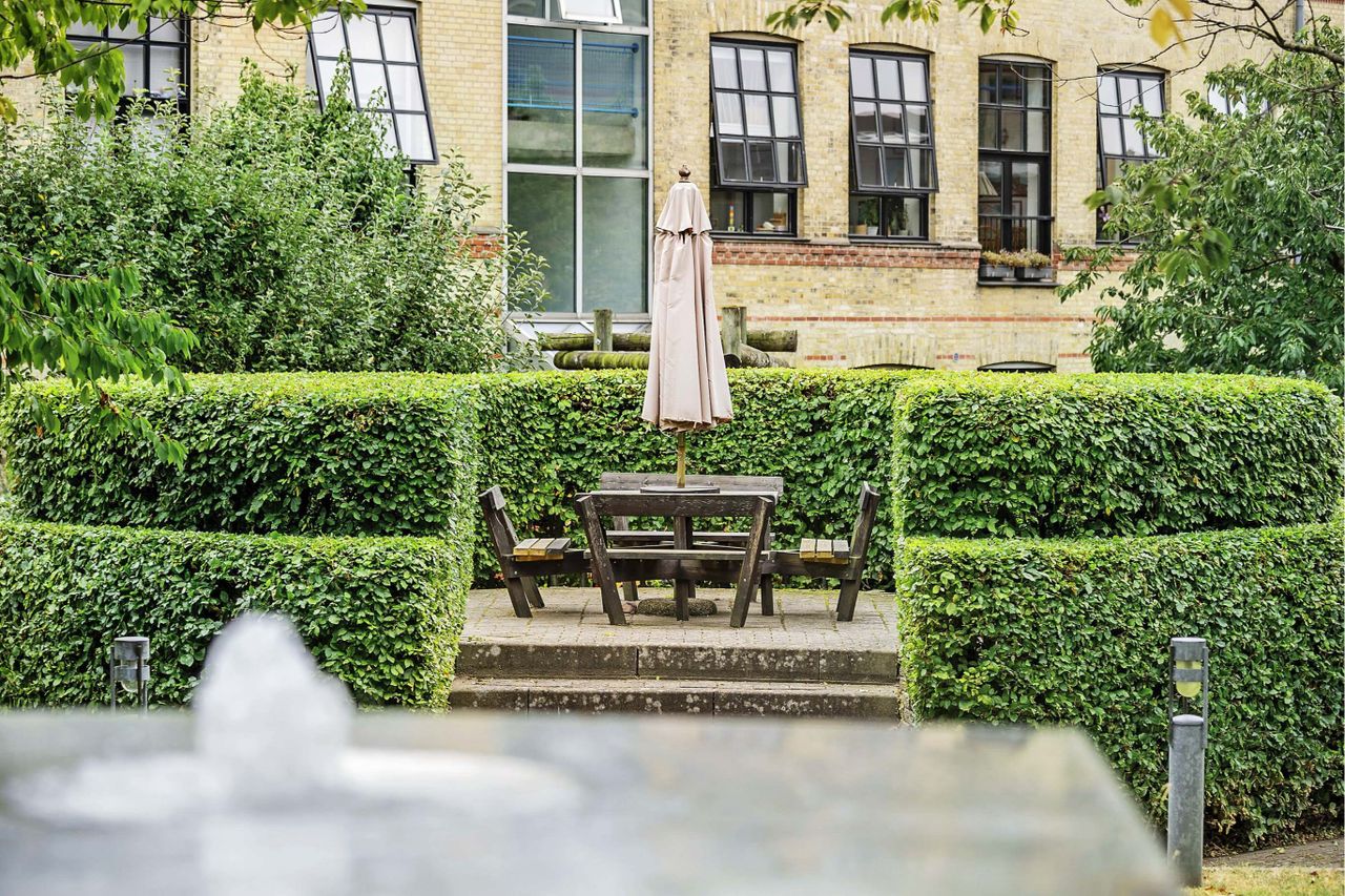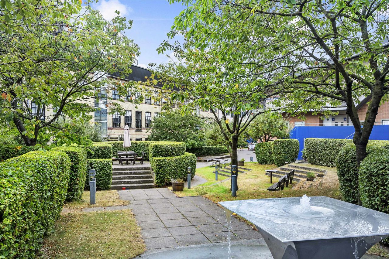 opstillede havemøbler. I gården ved springvandet, findes der er tre etages fælleshus med