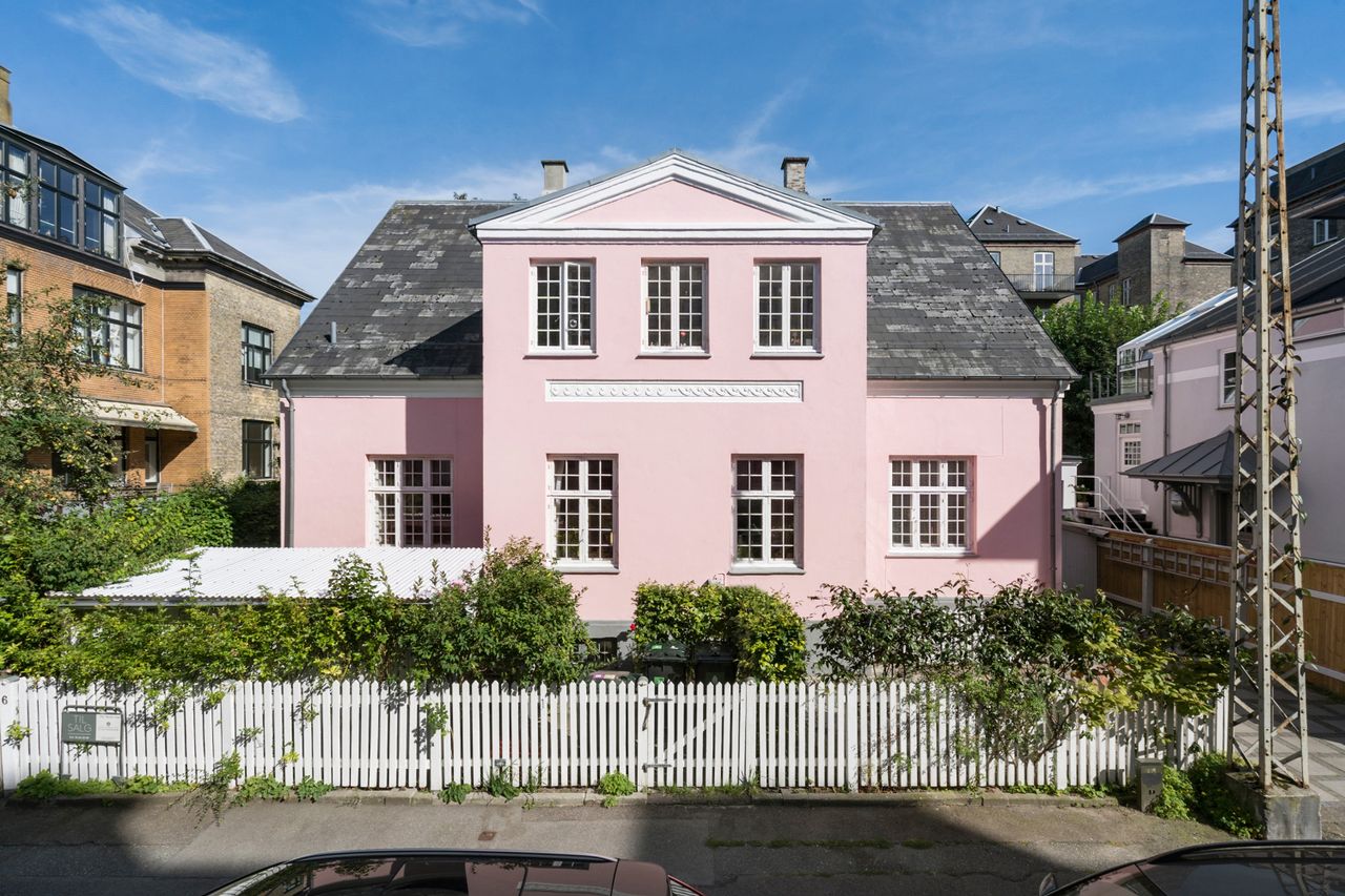 Man bemærker straks den smukke ikoniske lyserøde villa med de originale udsmykninger, når man tager sin gang gennem Mynstersvej. Ejendommen indeholder 2 ejerlejligheder og har opdelt have og parkeringspladser. Sælger har løbende vedligeholdt ejendommen - senest med malede facader, vinduer og sålbænke, malet hoveddør og frontparti samt fine dørklokker i messing.