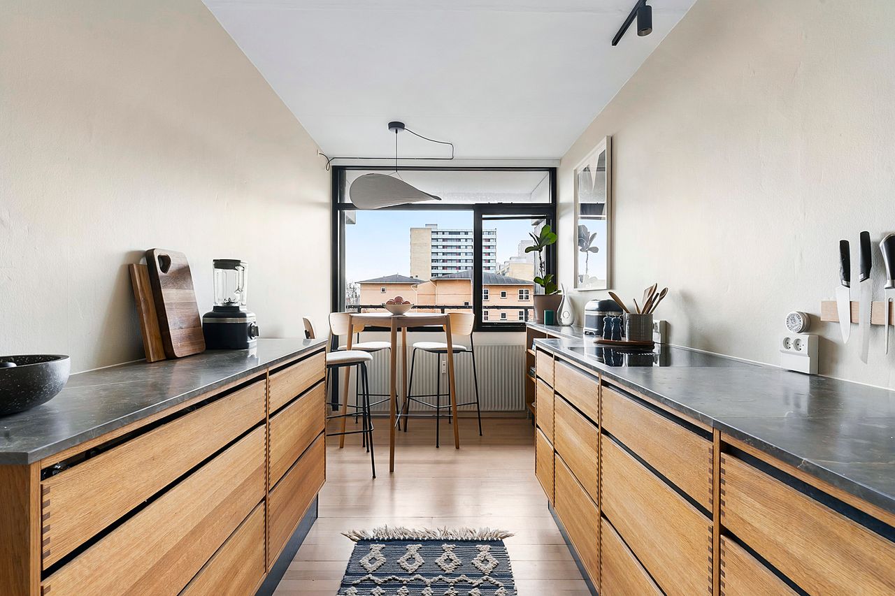 Køkkenet er renoveret af sælger med fokus på både kvalitet og æstetik. Du får et smagfuldt snedkerkøkken fra Heimwood, skræddersyet til lejligheden. Her er tænkt over detaljerne, fra de dybe skabe med god opbevaringsplads til skuffer med fingertappede egetræssamlinger og den smukkeste bordplade. De små, gennemtænkte løsninger som kaffestation m.m. fuldender helheden. Samtidig er der plads til et lille spisebord, hvor morgenkaffen eller en hurtig middag kan nydes. Lejligheden har en ideel planløsning, der giver fleksible indretningsmuligheder alt efter behov. I dag er boligen indrettet med en rummelig stue, fløjdøre ind til et master bedroom med stor skabsvæg samt et ekstra værelse. Og så til noget af det bedste, altanen. Udsigten er helt særlig og skal opleves. Altanen vender stik mod syd, hvilket giver optimale solforhold hele dagen. I sommerhalvåret bliver den et naturligt ekstra opholdsrum med plads til middagsselskaber under markisen, afslapning eller ren solnydelse. Her er du dejligt ugeneret.