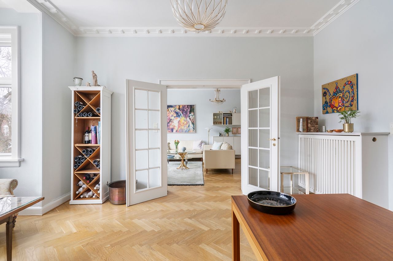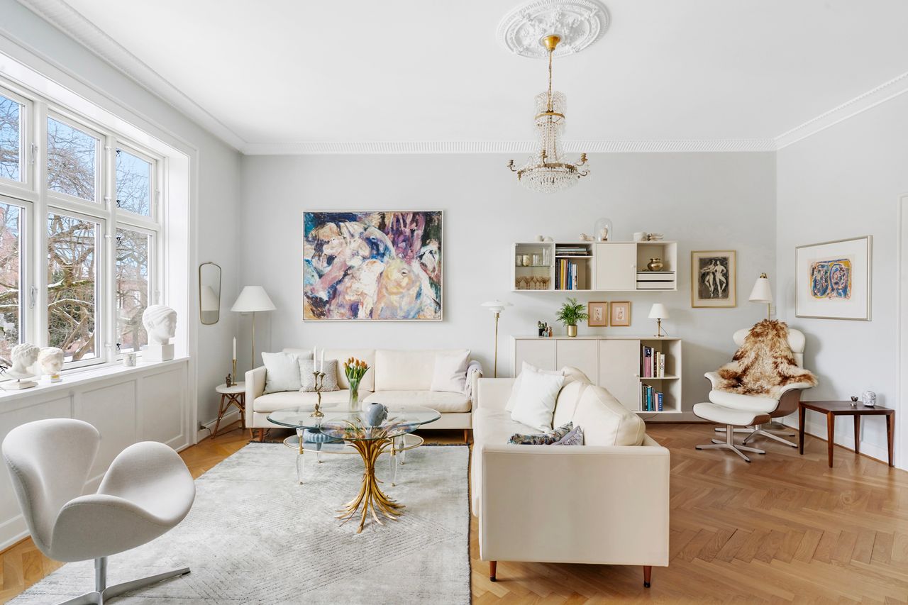 Lejligheden præsenterer sig med en markant herskabelig karakter og en gennemført elegance. Den er gennem tiden nænsomt renoveret med gennemtænkte løsninger, hvor der er taget stort hensyn til ejendommens oprindelige arkitektoniske udtryk. De store vinduespartier sikrer et smukt og naturligt lysindfald, og den uforstyrrede udsigt til naturens skiftende farver året rundt, lige uden for vinduerne, skaber en helt særlig ro.